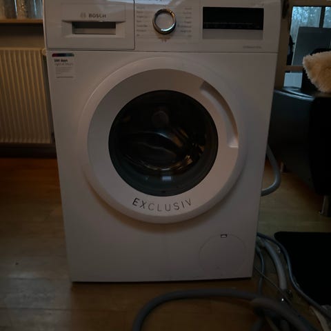 Bosch Frontbetjent vaskemaskine med digitalt display og drejeknap til programvalg. Hvid farve og standard størrelse til almindelig husholdningsbrug.