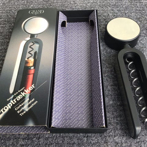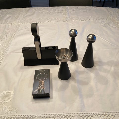 Rosendahl køkkenudstyr sæt bestående af flere dele i sort og rustfrit stål. Sættet inkluderer en vintragt, et vintermometer, en flaskeåbner, en proptrækker og en holder til opbevaring samt en folieskærer i æske.