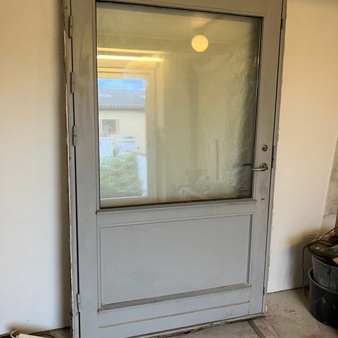 Der mangler en pynteliste i det ene felt, men det kan købes i den lokale trælast, døren leveres uden låsecyl men ellers komplet med håndtag og låsekasse.