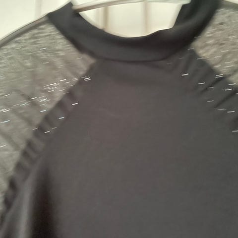 Elegant sort bluse med diskrete striber og lynlås foran pyntet med små metalliske studs.