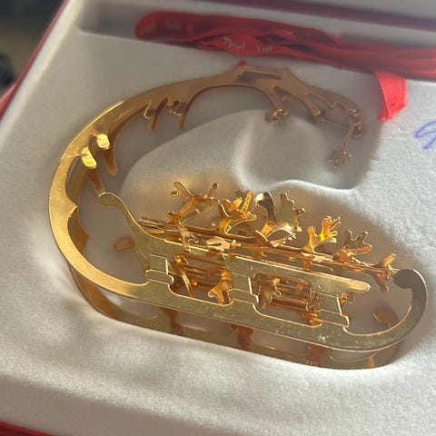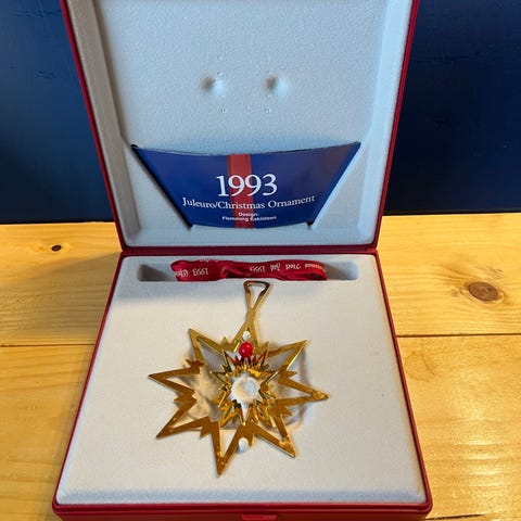 Georg Jensen Julepynt dekorationsornamenter fra årene 1996, 1998, 2000, 2002, 2007 og 2010. Ornamenterne er lavet i metal med guldfinish og leveres i original æske. Hvert ornament har sæsonbetonet design og kan anvendes som juledekoration. Se de enkelte priser nedenfor.
