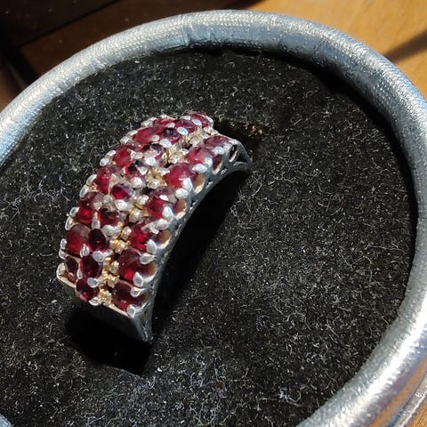 Meget smuk granat halskæde,flere rækker hvorimellem der er perler af sølv.Skal poleres.