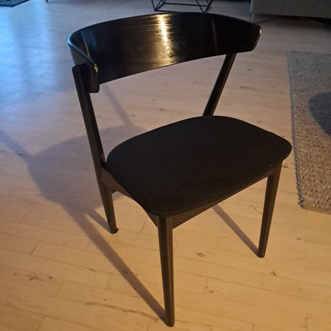 Dansk design klassiker fra Helge Sibast. En stilren stol i et fantastisk formsprog. Stolen er i god stand, stabil og fast i samlingerne. Den trænger til en slibning og oliering og de fleste ville nok også putte nyt betræk på. Betrækket er pænt og uden pletter, skyggerne på billederne fordi det lige er tørret over med en fugtig klud. Kan hentes ved Roskilde eller tages med til Ringsted.