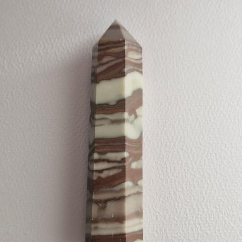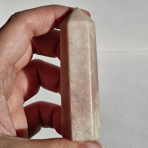Fint tårn/obelisk af pink opal i hvid modersten. Måler ca. 9,6cm og 88g.