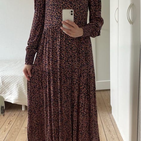 Mørkeblå maxikjole med brune og hvide detaljer. Den har en inderkjole, elastikbånd ved maveregionen og en flæse i bunden.
