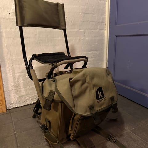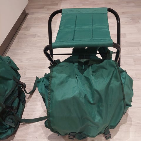 foldbar stol med integreret rygsæk i grøn farve. Stolen har en metalramme og stofsæde med rygstøtte. Rygsækken er fastgjort til stolen og har snørelukning for lukning. Produktet er bærbart og velegnet til udendørs brug.