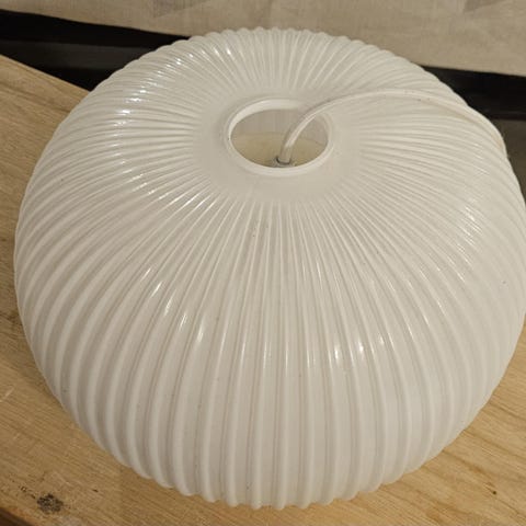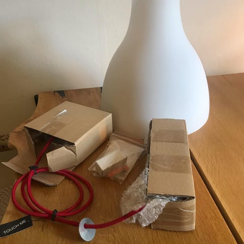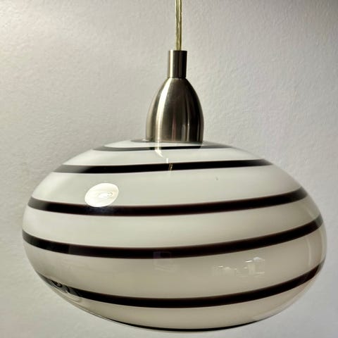 Flot grå blå glas lampe med sort stofledning og fatning.