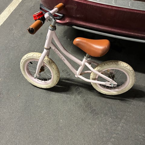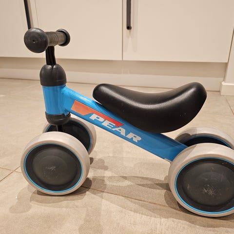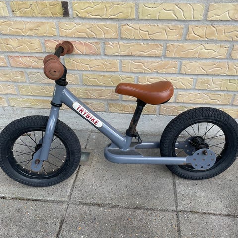 Wooden balance bike designed for children, featuring a natural wood frame with black wheels and an adjustable seat. The bike is lightweight and suitable for developing balance and coordination skills in young riders.