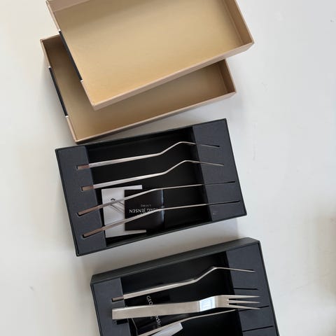 Håndtagene er lavet af messing, mens delene, der bruges til spisning er i rustfrit stål.