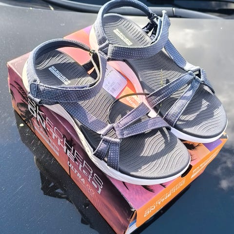 Smukke Skechers yoga form sandaler med shiny sten brugt to gange .som nye se billeder . Str 36. En 37 kan også passe