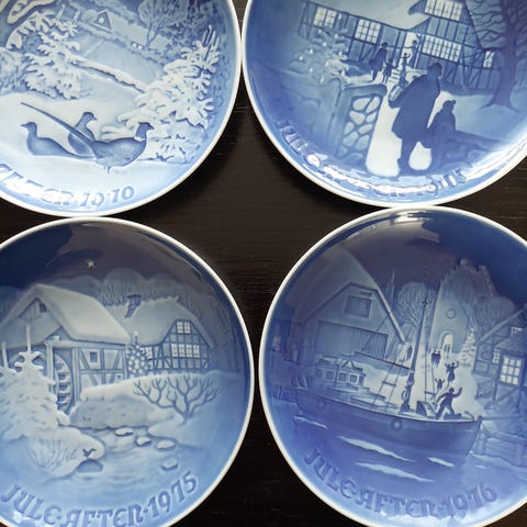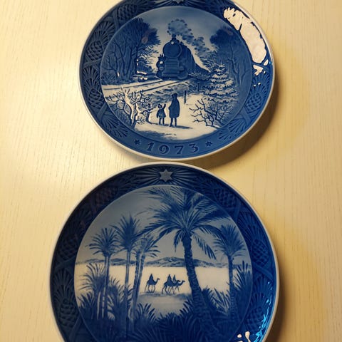 Bing & Grøndahl Juleplatte samling bestående af flere blå porcelæn tallerkener med forskellige julemotiver. Tallerkenerne er dekoreret med traditionelle danske juletemaer i blå og hvid farve. Serien er velegnet til samlere og til udsmykning i hjemmet.