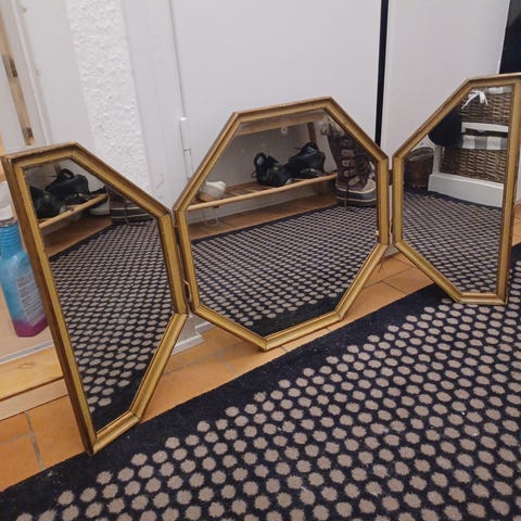 Superfint gammelt spejl. Er dog lidt anløbet i kanten hist og pist. Har dog læst at det kan fjernes med bagepulver og eddike hvis man piller bagbeklædningen af.