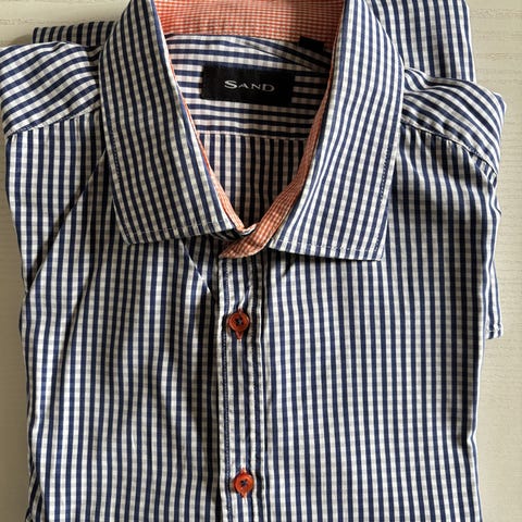 Lækker SAND skjorte i størrelse M, blå med mønster. Fremstillet af 55% hør og 45% bomuld. Kortærmet model med knaplukning. Ung model. Den røde Lewis t shirt følger gratis med i købet - hvis det ønskes.