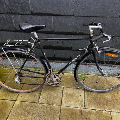 En god brugsracer med skærme. Istandsat af Nærum Cykler. Har stået i skur og fordrer smøring og et gearkabel skal skiftes. Kører rigtig godt. Er på billedet indstillet til 193 cm høj.