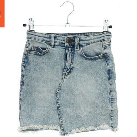 Denne nederdel er lys blå med et fint blomstermønster. Den har en elastisk talje og et skørt med let flæset design. Materialet ser ud til at være let og luftigt, ideelt til sommerbrug.