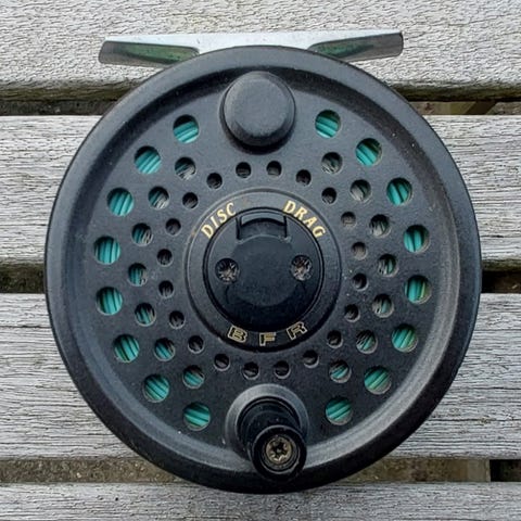 Ældre vintage fluehjul, med ældre Hardy wet fly 2 line DT-8