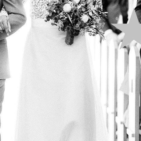 Smuk cremehvid brudekjole i størrelse 38. Kjolen er to-delt med blondetop og en lang flydende nederdel med lille slæb.