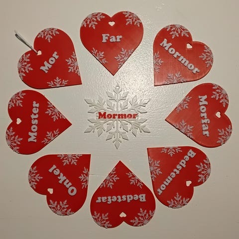❤ Julesok, hjerte eller snefnug med valgfrit navn og krog til ophæng. Hjerte ca 8 cm. med valgfrit navn og krog til ophæng 25 kr. Eget design. Hjerterne kan laves I flere farver. Hjerterne er lavet af pla som er genanvendelig og biologisk nedbrydelig. Jeg har fået at vide at de sagtens kan bruges udenfor.