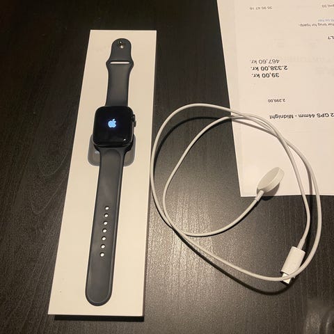Apple Watch SE Nike edition smartwatch med 40mm sort aluminium kasse. Uret har en sort flettet nylonrem og leveres med ekstra remme i forskellige farver og materialer, samt beskttelseskasse. Passer til både mænd og kvinder.
