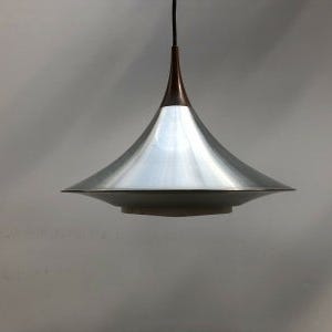 Pendel i glas,med skærm i grålakeret aluminium,top i teaktræ.