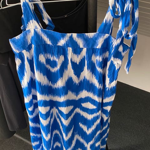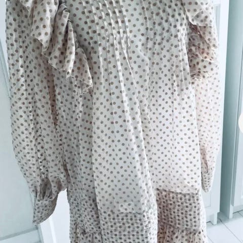 Flot strik kjole med høj hals, frynser, og i lys beige farve. Med korte skulder ærmer. Den er I str xs/s. Og den kan udvides. Mål fra skulder og ned til kant hvor frynser starter 60cm, og fra kant ned med frynser 33cm. Brugt 1 gang, så klippet mærket af da det kradset i nakken. Står som ny