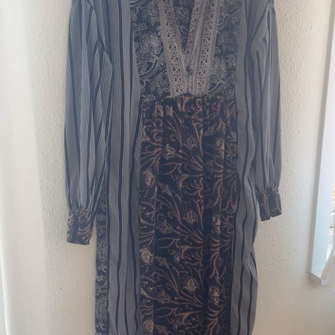 Meget flot lang kjole i blankt stof med etager, flæser og guldprikker i stoffet.