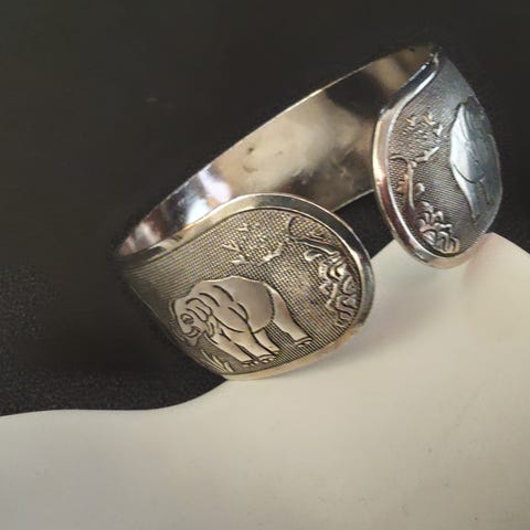 Dette er et vintage cuff-armbånd fra Mexico med en indlagt blomst af perlemor og abaloneskal, lavet af Alpaca-sølv.