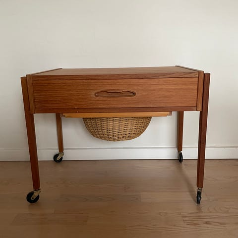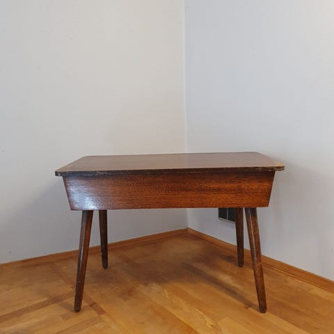 Fint lille sybord / sidebord fra 50’erne udført i bøg og fineret teak. Bordpladen kan skubbes til siden, så der er mulighed for opbevaring af blade, magasiner, snolder mv.