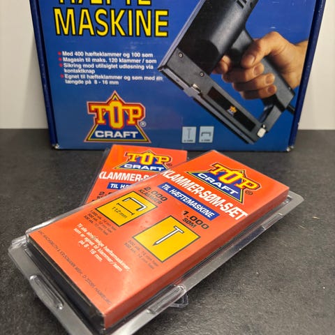 Stanley håndhæftemaskine til brug med hæfteklammer. Værktøjet har et ergonomisk håndtag for bedre greb og kontrol. Velegnet til hæftning af papir, stof eller lette materialer i forskellige projekter.