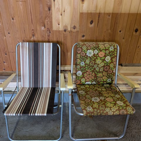 Sælger disse fem positionsstole, der kan foldes sammen. De bærer præg af at have mange år på bagen - så har en del beskidthed og misfarvninger pga vind og vejr.