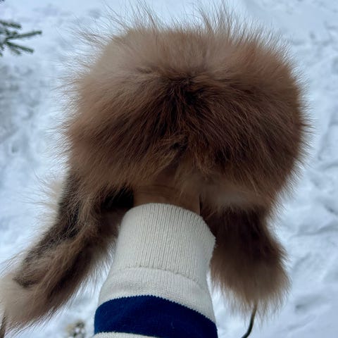 Lækker og varm hue, ægte pels. Ræv/ polarræv. Farven er sort/ lidt mørke brun. Helt unik. Passe til barn på 10 - 16 år. Mit hoved har omkreds på ca. 52 cm og huen er lille smule for stram til mig.