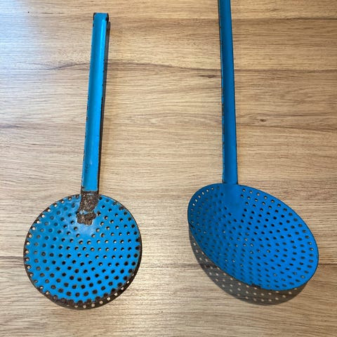 Madam Blå hulskeer, med blå hoveder og sorte håndtag.