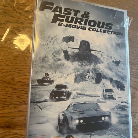 Fast & Furious DVD samling bestående af 5 film. Indeholder film med biltema, action og drama. DVD'erne er pakket i en foldbar cover med billeder af filmens karakterer og biler.