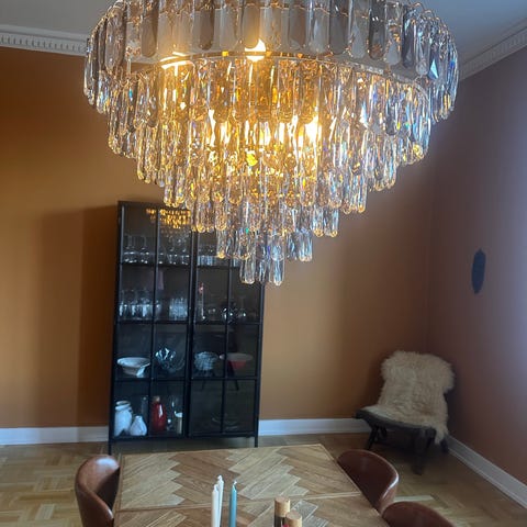 Smuk krystal lysekrone, empire model, krystal prismer med såkaldt vandfald øverst. 6 lysestager til levende lys. Bronze/messing. Købt hos C.E. Fritzsche i Kompagnistræde i København i beg. af 1960´erne.
