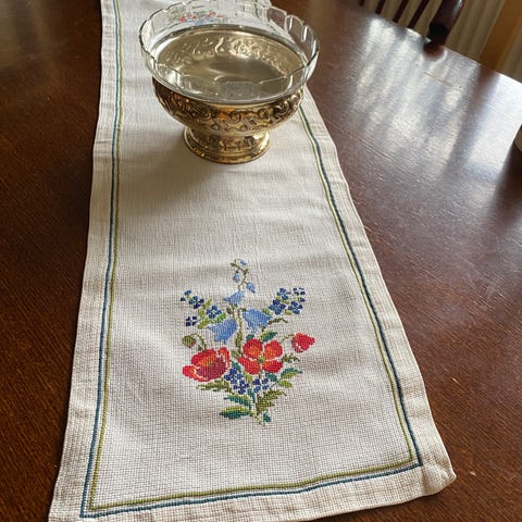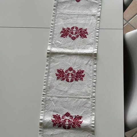FIN BORDLØBER ,BRODERET MED BLONSTER OG BLADE ,SIDERNE ER I BUER !! PÅ HVID BOMULD !