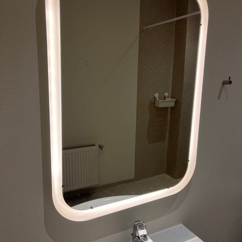 IKEA LED Mirror with dimensions 120x85 cm. The mirror includes integrated LED lighting and is designed for wall mounting. Suitable for use in bathrooms or dressing areas. The frame is white, and the mirror provides clear reflection with energy-efficient lighting.