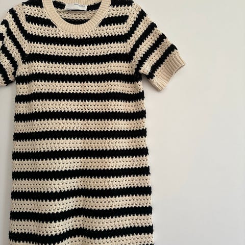 Lækker selected femme strikkjole. Uldblanding som ikke kradser. Str xl. Måler 102 cm om brystet, uden at trække i kjolen. Måler 114 cm fra under kraven og ned bagpå. Var brugt 1 gang kortvarigt. De 4 første billeder er fra nettet