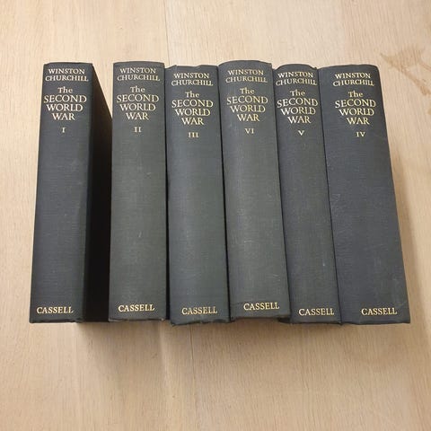 Smukt komplet sæt af Winston S. Churchills storværk Den Anden Verdenskrig, udgivet på Chr. Erichsens Forlag i 1950’erne.