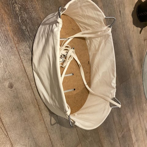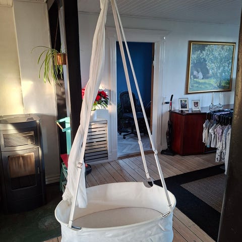 Vugge, med ophæng, himmel, madras og orginal lagen