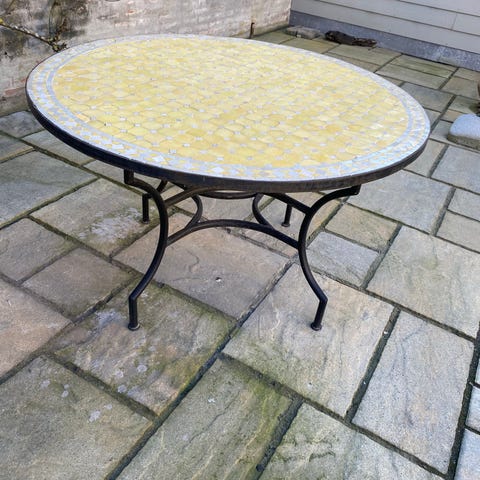Bellis mosaik bord lagt på helt nyt grønt cafebord i metal fra Silvan