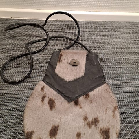 1) Rødt sælskind på forsiden. Læder på bagsiden. Crossbody taske med lille lomme foran. Aldrig brugt. Mål: 15 x 20 cm
