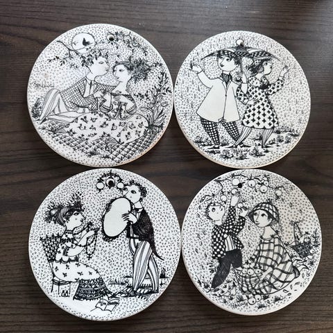 Sættet består af 9 runde plader med forskellige motiver, stemplet mm bagpå, hver med hul til ophængning. De er alle i pæn og intakt stand og sælges kun samlet til prisen !