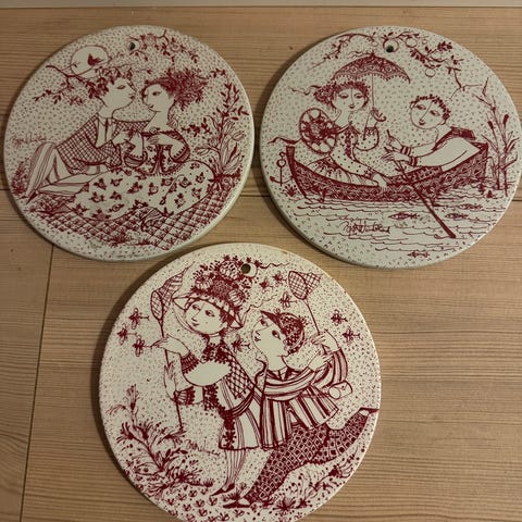 De fine platter i keramisk materiale med rød og hvid dekoration.