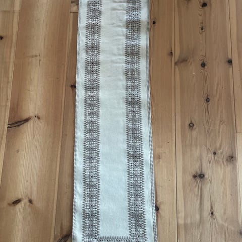 En hæklet løber med 8 mellemlægsservietter. Løberen er 128cm lang og 20cm bred. Mellemlægsservietterne 22x19cm.