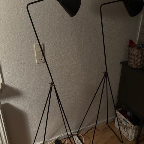 Grå industriel standerlampe. Armen kan bøjes 5 forskellige steder.