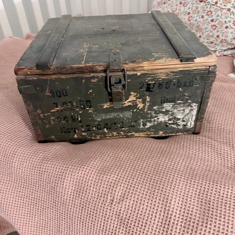 Nyt bord el opbevaring? Vintage ammunitionskasse med håndtag og hængsel, der kan holde låget åbent. L: 64cm D: 34cm H: 31 cm. Indersiden er træ. Målene er de udvendige mål.