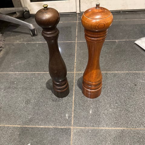 Salt og peberkværnsæt i lyst træ, flot stand, få brugsspor og kværne virker godt