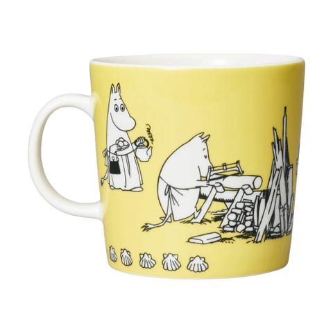Arabia Moomin krus i keramik med gul farve og Moomin-tema. Kruset er designet til daglig brug og har et håndtag for nem håndtering. Det er produceret i Finland og egnet til servering af varme drikke. 30cl