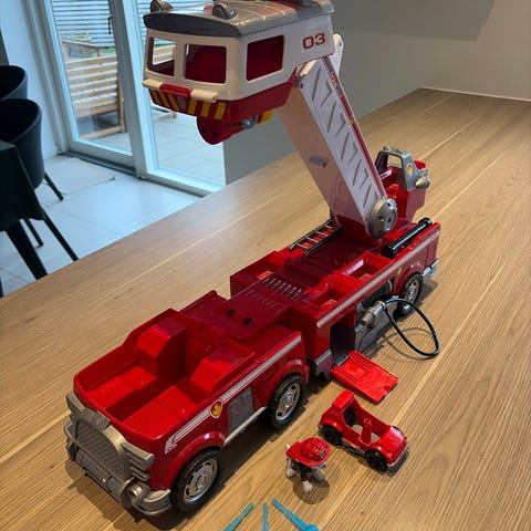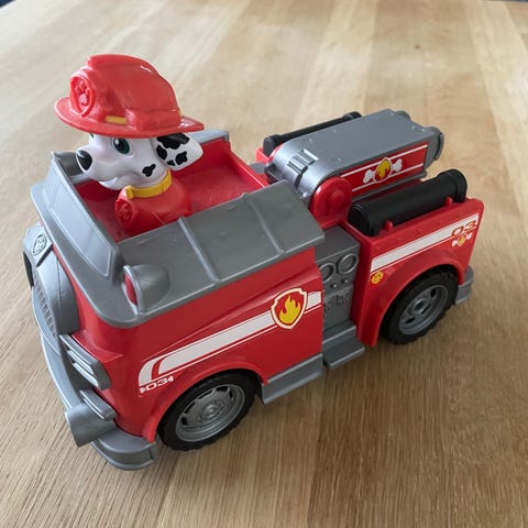 Paw Patrol brandbil legetøj i rød plast med bevægelige dele og en tilhørende figur. Designet til børn, egnet til rolleleg og udvikling af fantasi.