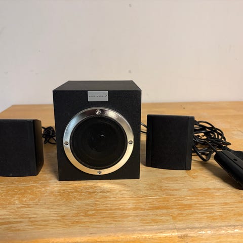 To højtalere, til at stille bag computern, der giver en særdeles god lyd. Indstilling for både volunen, bas, trible. Tilslutning for hovedtelefon. Farve: Lys grå og sort. H=20cm, B=11cm D=12cm.